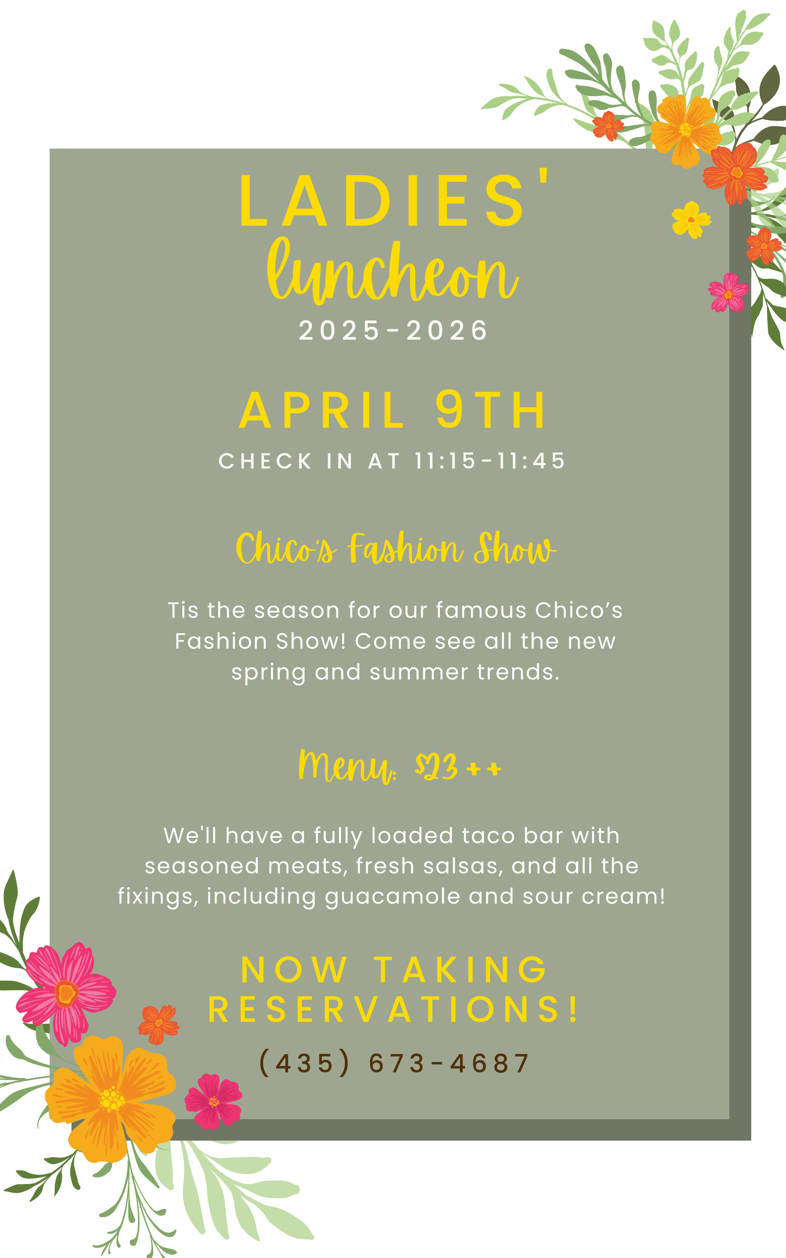 Ladies Luncheon Thursday, April 9, 2026 11:15 AM 2:00 PM 11:15 14:00 Bloomington Country Club 3174 South Bloomington Drive East St. George, UT, 84790 United States (map) Google Calendar ICS