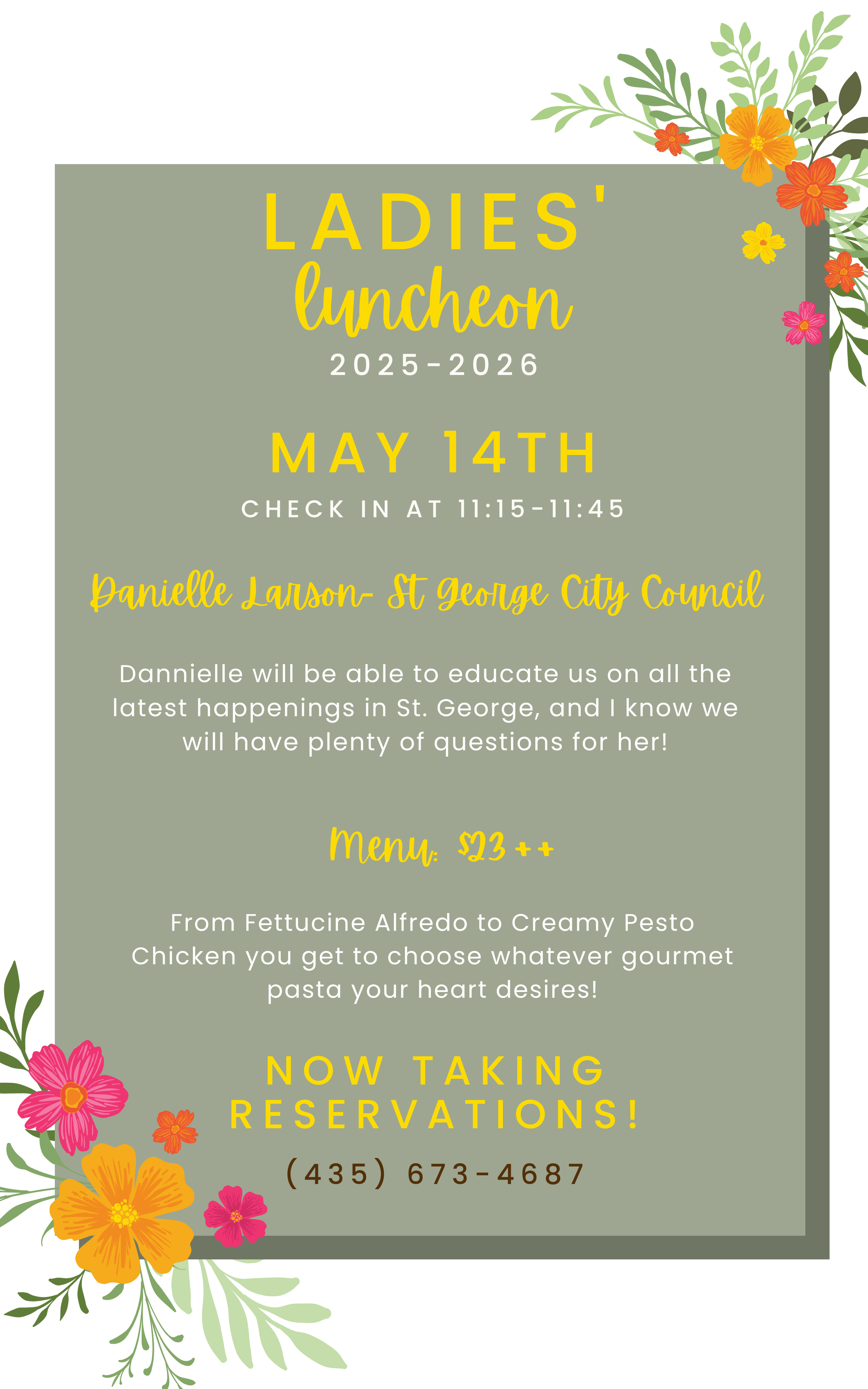 Ladies' Luncheon Thursday, May 14, 2026 11:15 AM 2:00 PM 11:15 14:00 Bloomington Country Club 3174 South Bloomington Drive East St. George, UT, 84790 United States (map) Google Calendar ICS